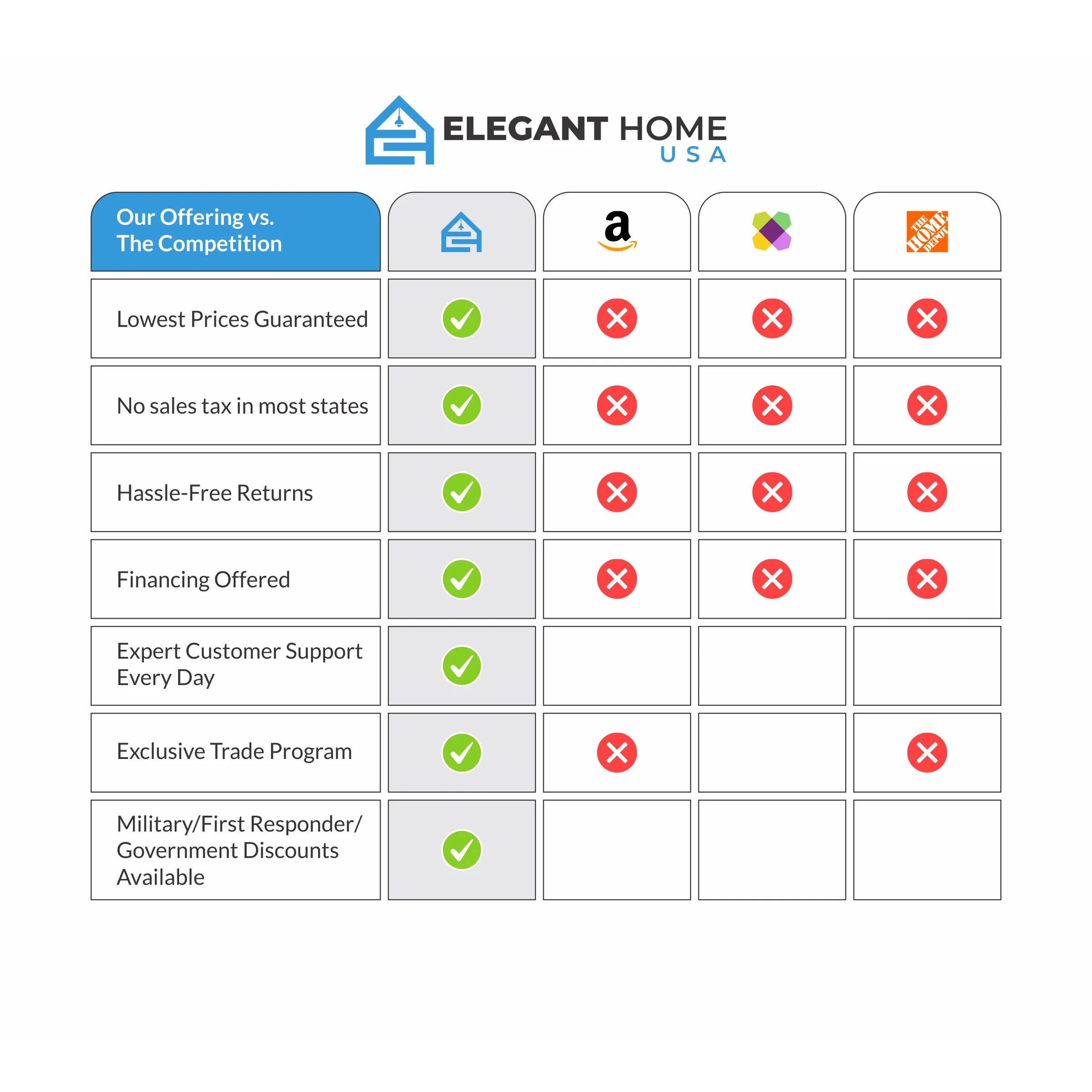 1) Amazing Customer Service: We put our customers first. Compared to big box retailers, you can expect to speak to a REAL person at all times and quickly. Give us a call and one of our customer service agents will be there to help you with anything you may need. We're not like most companies who look at you as just an order number, you matter to us and your order is assigned to an agent who truly wants to make sure you are satisfied.