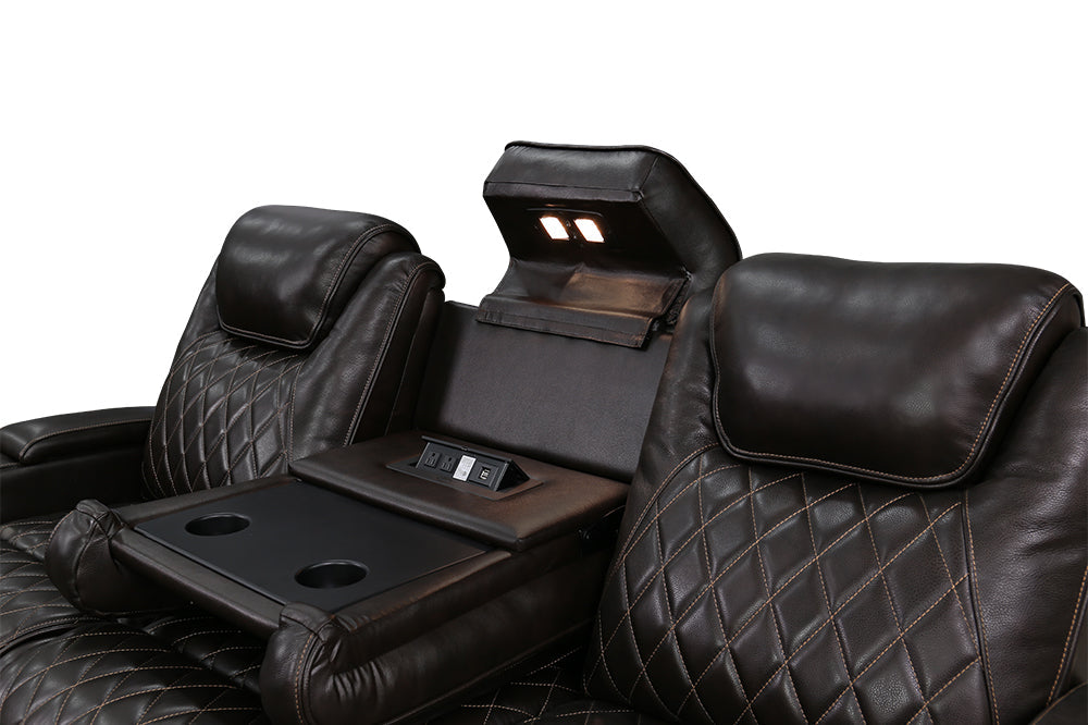 The Oslo Console will become the centerpiece of your home theater room. The classy finishes and neat design will be heightened by the cozy cushions, pneumatic lumbar support, and powered headrest, making it easier for you to drop down and relax every time. Coupled with the drop-down center console which provides you with additional cup holders, lights, and plugs, your evenings will never be the same again. Both the left and right end seats are full power recliners with power lumbar and headrest adjustability.