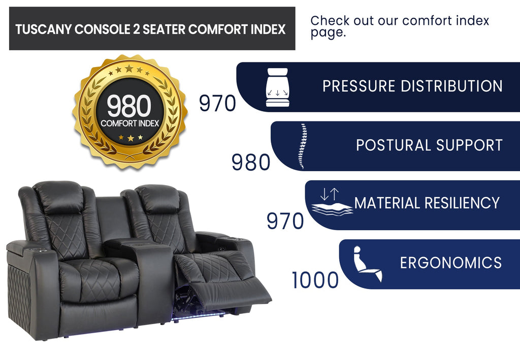 Combining design and function, the Tuscany Console provides luxury through its supple leather, cozy cushions, supportive headrest and a center console that holds your favorite glass of wine and food platter. Both the left and right end seats are full power recliners with power lumbar and headrest adjustability. Customization is possible so tailor as you see fit and enjoy the ultimate home theater experience with the Tuscany Console.