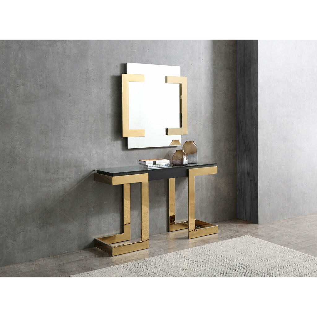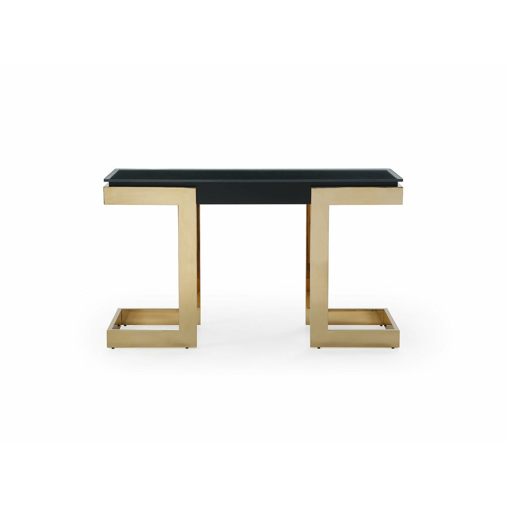 Modern, sleek, and space conscious. The Sumo console table is the definition of contemporary design and glam. The Sumo Console is offered in a beautiful, high gloss black top with a 10mm glass piece on top. Base is made of gold stainless steel. This table is the finishing touch for any room, it can be placed along a wall, behind the sofa or with its matching dining set. It can even be used as a slim entertainment unit to save space Top of Form
