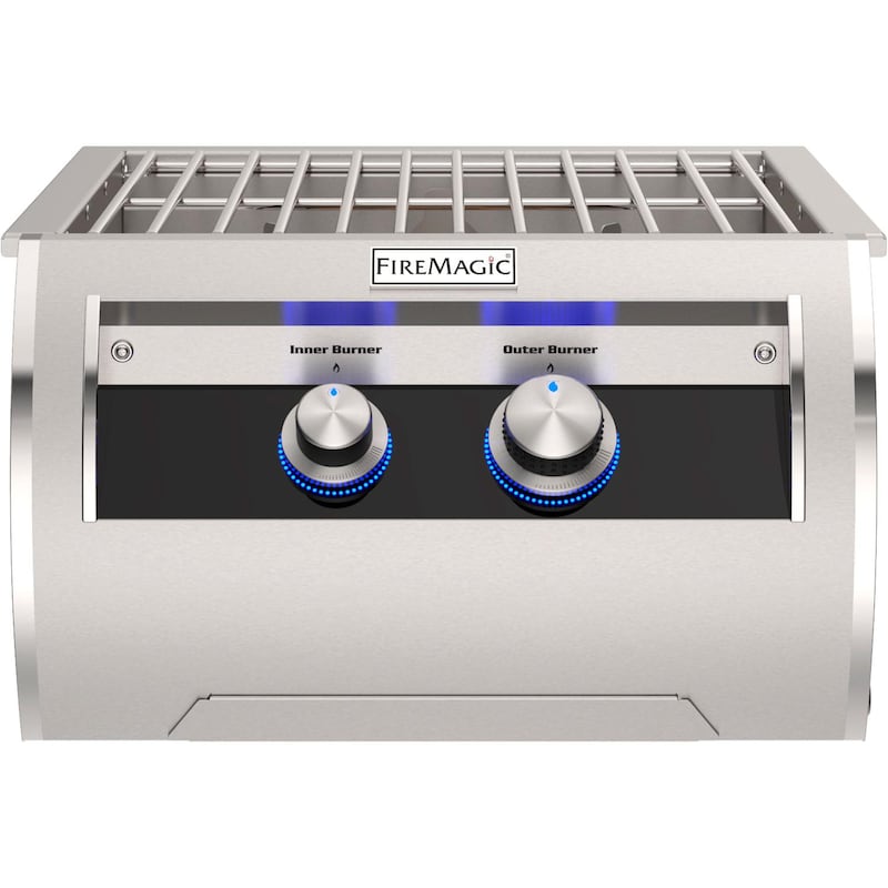 Fire Magic offers precision and performance in a small package with its line of side-cookers that, like their grills, are made in the USA. The versatile and powerful Echelon Diamond Power Burner is perfect for stock pots, woks, and more. The inner and outer natural gas ring burners combine for a total of 60,000 BTUs. The inner ring has a range of 3,000 to 15,000 BTUs, while the outer ring has a maximum of 45,000 BTUs. It features back-lit control knobs on elegantly designed black glass facing for modern style that matches its performance. Stainless Steel cooking grids are included as well as a stainless steel lid to protect the interior of the unit from the elements. This Power Burner hooks up to Fire Magic Echelon Diamond Series Grills or can be wired individually with using a separate power supply box (sold separately). The Echelon Diamond Power Burner is the perfect accessory for your luxury outdoor kitchen.