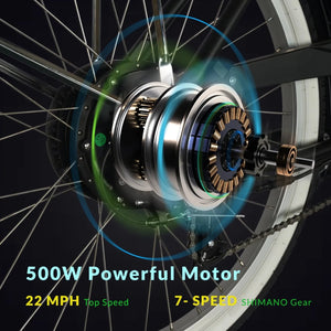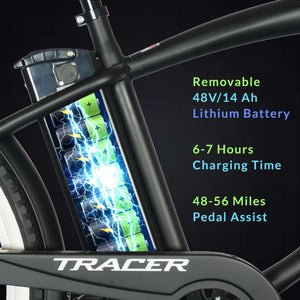 The Tracer 500W 26" Omega Beach Cruiser Electric Bike features a 500W brushless motor, providing strong driving force and enough energy for your daily commute, cruising in the mountains, or riding along your favorite trails. and the maximum speed can reach 20 miles per hour.