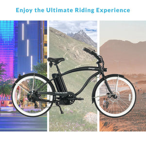 The Omega Beach Cruiser Electric Bike is stylish, comfortable, and a great choice for people who like to go on adventures. So don't look any further than the Tracer Omega 26" Electric Beach Cruiser Bike! This amazing bike has two 26" whitewall tires, a SHIMANO Tourney 7-speed rear derailleur, dual disk brakes, a Panasonic built-in battery, an LCD display, and a powerful XIONGDA motor with 48V and 500W.