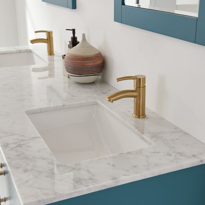 Clean, refined and elegant: that’s the essence of the Sutton Vanity. This beautiful, sturdy furnishing offers an eye-catching medley of finishes, from the gorgeous marble countertop and smooth cabinets to the golden-toned hardware. You’ll love all the storage inside—perfect for housing your favorite towels and other bathroom essentials.