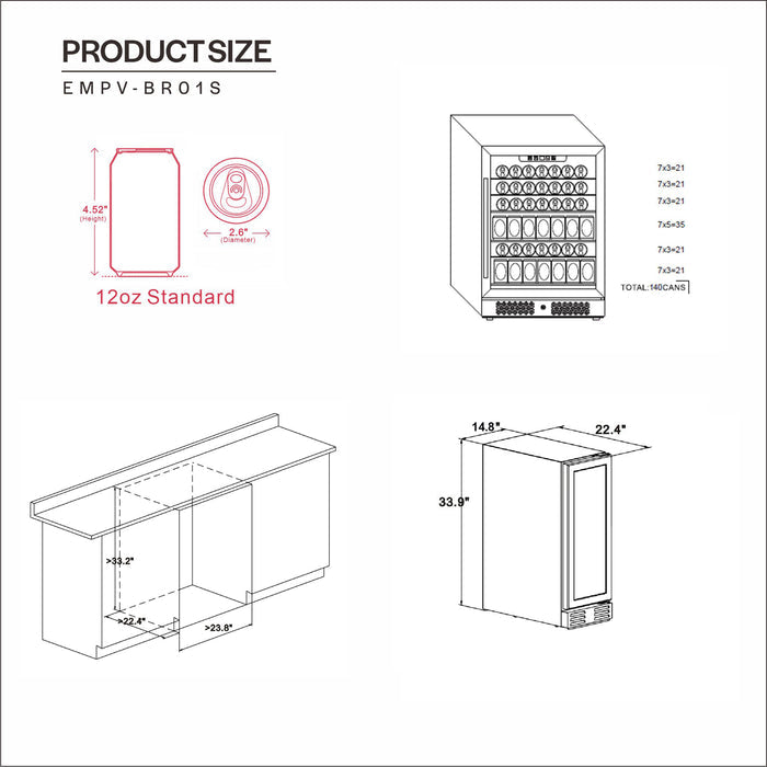 Empava BR01S 15 Inch Wine Cooler Undercounter 3cu.ft 84 Cans Mini Fridge