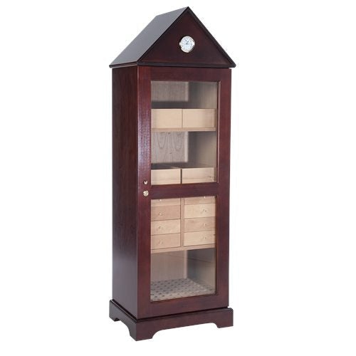 The Verona Deluxe Humidor by Quality Importers is the perfect way to store your cigars. It features a dual-pane tempered beveled glass door, gold plated lock and key, and an analog hygrometer with a brass frame finished with a deep Mahogany coat, looking great in any setting. On the inside, there are 8 drawers and 4 removable drawers, all lined with Spanish cedar. The Verona humidor also features hidden piano hinges for added aesthetics! And, at the bottom are 2 interior A/C outlets for convenience and corner wheels for portability.