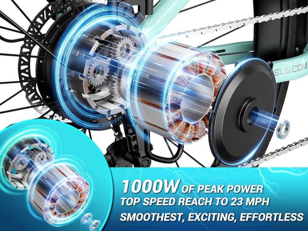 SUTT0 (a sub-brand of BAFANG) brushless rear-wheel drive motor, 70Nm torque, 23 miles per hour throttle mode. Pedal-assist mode can reach up to 28 mph with adjustable speed.