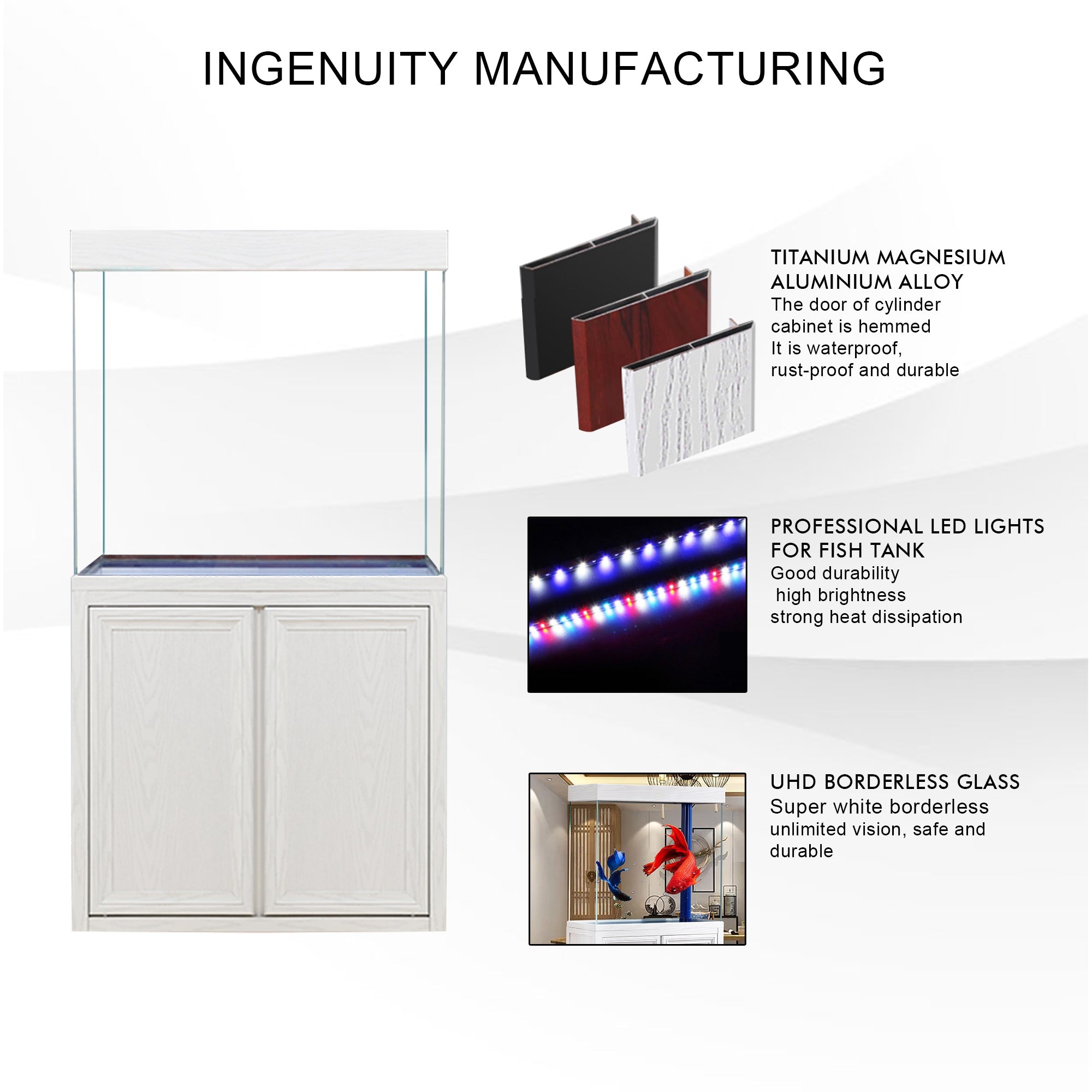 The fish tank is made of high-quality low-iron tempered ultra-white transparent glass ("crystal glass"), with a light transmittance of >91.5% for a clearer-looking tank that is more resistant to scratches and fingerprints. Robust ~0.315 inches thick glass paneling allows the tank to easily withstand the impact of everyday use as well as increase acid and alkali resilience. Each panel is bonded by a German high-endurance biophilic silica gel which can resist saltwater erosion for up to 20 years.