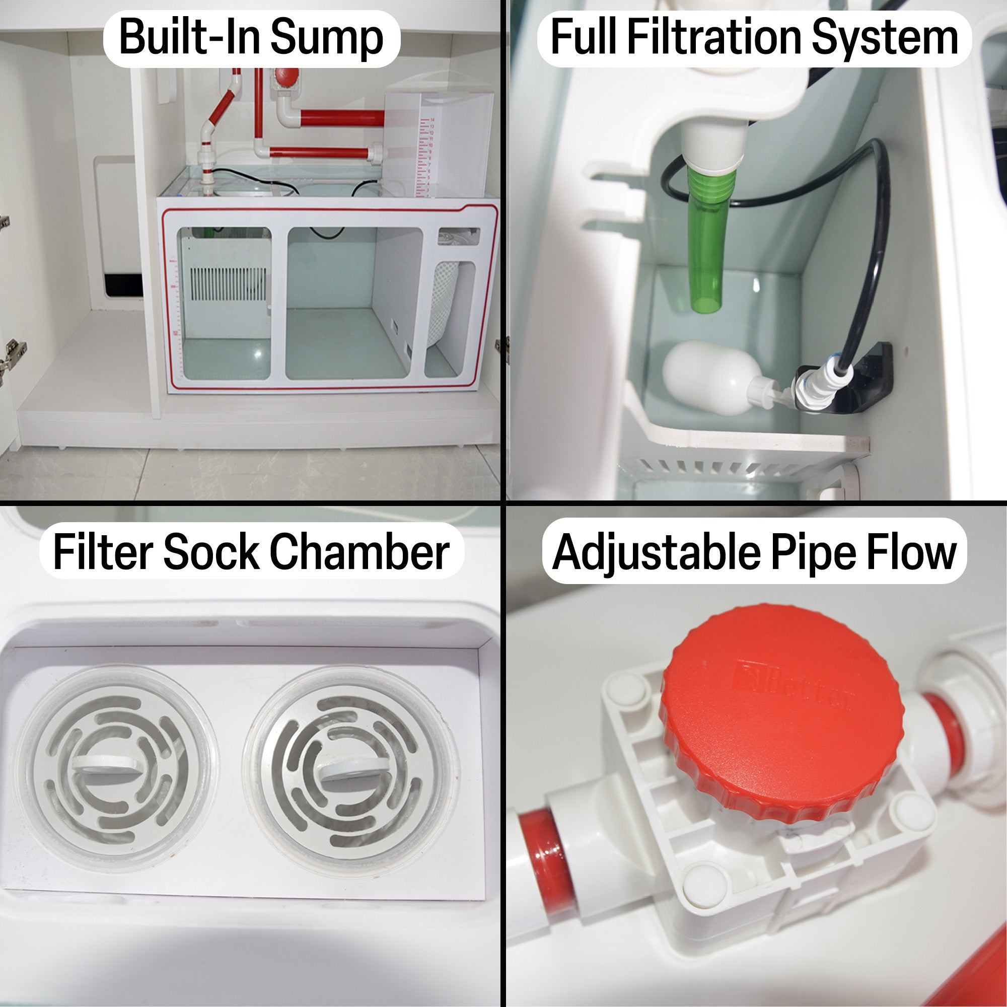 • SUMP DESIGNED FOR CORALS: An improved sump system fit for any coral reef system. Includes a filter sock section, protein skimmer section/general use section, a top-off reservoir, a section fit for your own choosing, and a section for a return pump (return pump and protein skimmer provided with purchase). A sump system perfect for optimally filtering your water to keep your water system healthy and crystal clear.