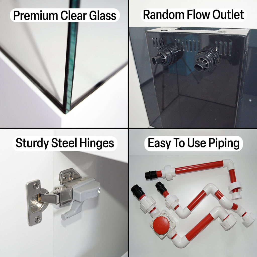 • INCLUDED IN PURCHASE: One 95-gallon tank, one prebuilt high-quality matte finish cabinet, one sump filtration system built into the cabinet with a water capacity of 35 gallons, and easy-to-install pipes for your aquarium plumbing.
