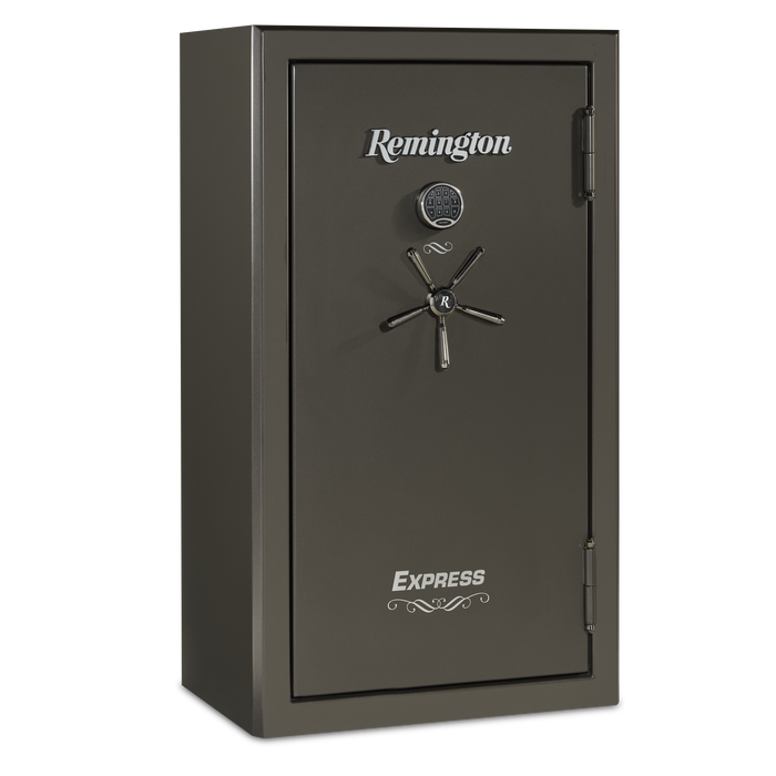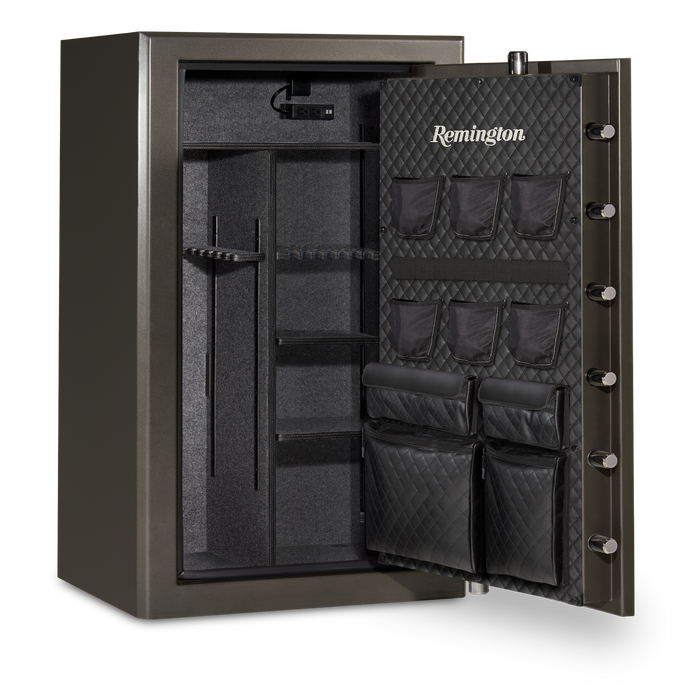 Admiring the harmony of innovation and time-proven excellence is what the Remington Express 34-Gun Safe is all about. Prepared for the elements with a 12-gauge industrial steel body and Triple Seal™ technology, this fireproof and waterproof safe is one you can depend on to keep your firearms and valuables protected. Backed by a high-performance SecuRam™ UL Rated electronic lock, twelve robust steel locking bolts, and a relocker device for maximum in-home security. Motion-activated LED lights come installed inside your safe for easy access in low light conditions. The fully carpeted interior features ample storage with the deluxe pocket door organizer, Zero-Sag steel-reinforced top shelf, barrel rests, and adjustable side shelves. Keep your favorite gun safe accessories charged with the integrated UL Rated dual power outlets and two USB ports. Includes a waterproof bolt-down kit for use with the four pre-drilled holes and our best-in-class Lifetime Warranty that covers your entire Remington safe against theft, fire, natural flood, locks, parts, and paint.