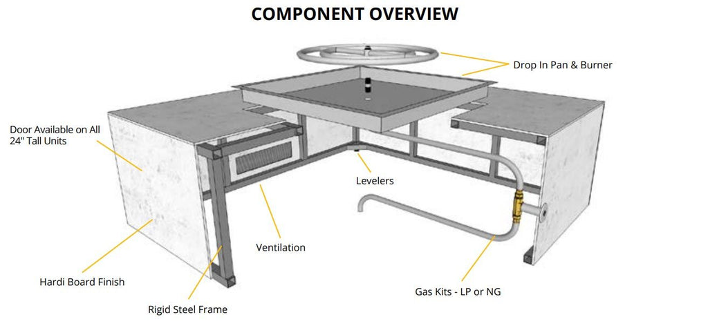 This partially finished 60-inch square fire table form comes complete with a 24x24-inch drop-in burner pan, 18-inch burner, key valve, whistle free hoses and a stainless steel air vent to make complete installation as easy and safe as possible. This fire pit package allows you to choose from Match Light, Spark, 110V Electronic or 30DC Electronic options and comes with or without a propane tank door depending on your needs. Choose from the options above and make your patio dreams come true!